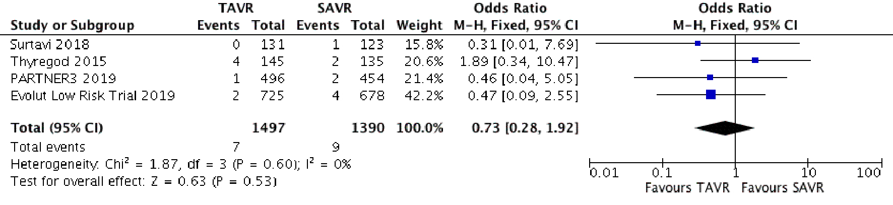 Conclusions: Among low risk patients, TAVR was found to be superior in short-term all-cause mortality and 1-year stroke, a result that was statistically significant for TAVR and close to significance for stroke. TAVR patients were also less likely to have post-operative bleeding and AKI stage 2 and beyond. Post-operative incidence of endocarditis among TAVR patients was low but not statistically significant. However, the rates of PPM and vascular complications are higher in TAVR patients. The results of TAVR in low risk population are thus extremely encouraging. However, the issue of long-term valve durability in this group needs further studies. Also, caution needs to be exercised while extending the indications to extremely young patients due to lack of enough studies.