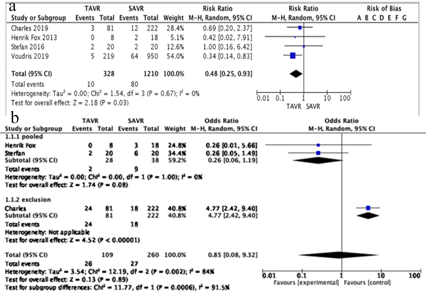 The 30-day in-hospital mortality was studied in 1,538 patients (TAVR 328, SAVR 1,210). TAVR had better outcomes in terms of 30-day mortality than SAVR (odds ratio (OR): 0.48, 95% CI: 0.25 - 0.93; P = 0.03) (Fig. 2a). After the exclusion of Voudris et al, mortality at 30 day is comparable between the two groups (OR: 0.72, 95% CI: 0.27 - 1.91; P = 0.51) [19].