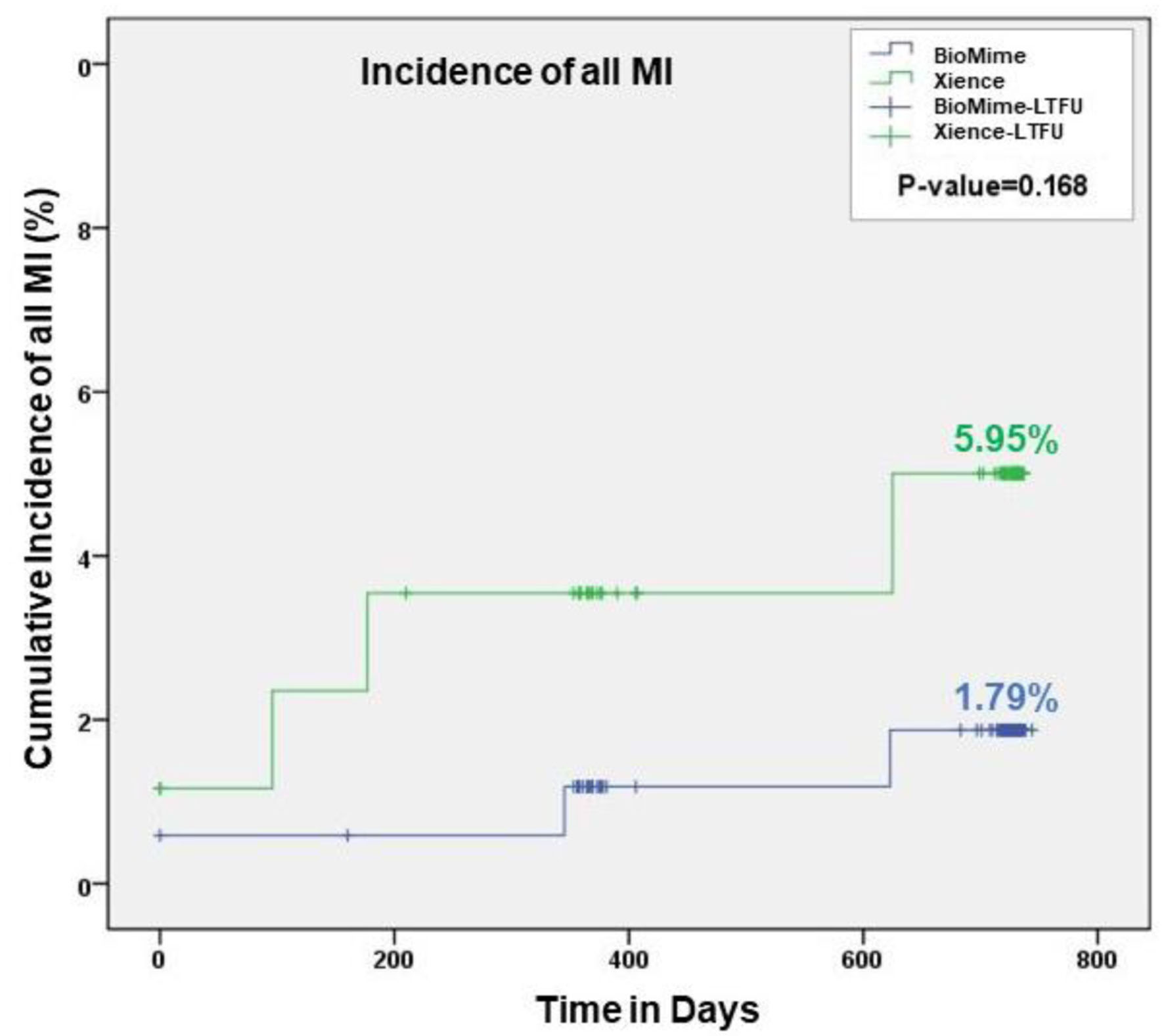 Regarding the numerical differences in the incidences of all MI between both study arms, we noted that in the BioMime SES arm, one elderly patient aged 76 years had prior PCI and MI, with liver disease, chronic lung disease, renal insufficiency, peripheral vascular disease, along with traditional cardiac risk factors (dyslipidemia and hypertension). This patient experienced recurrent MI after few months of the index PCI and underwent repeat PCI. The MI incidences in this group are relatively low (1.79%). Whereas, in the XIENCE arm (5.95%), one younger, highly comorbid patient experienced two recurrent MI events, which contributed to the high MI incidence rate in the XIENCE arm. This patient had lung and renal disease, along with peripheral vascular disease and was a regular smoker. The other MI incidences recorded of the XIENCE arm were among non-smoking patients who had significant underlying systemic diseases (liver disease, anemia, lung disease, and renal insufficiency) and cardiac risk factors (hypertension, and peripheral vascular disease). These factors may have contributed to the relatively higher MI frequency in the XIENCE arm.