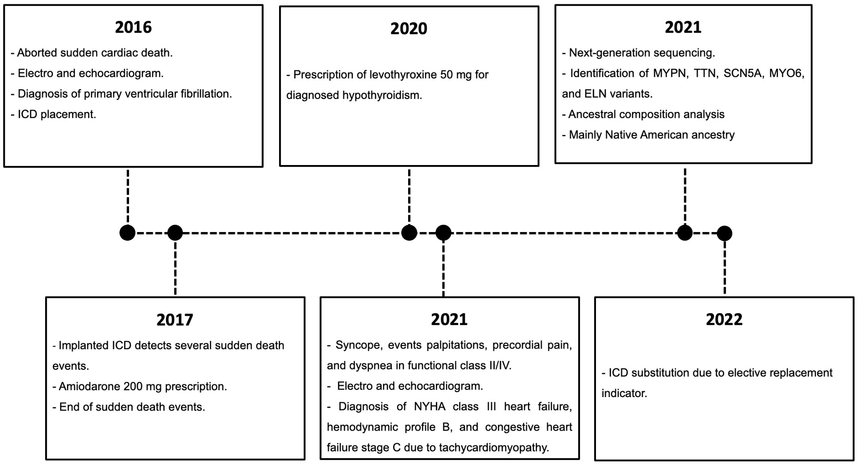 Five years after the SCD incident, the individual was hospitalized due to new syncope events, palpitations, precordial pain, and dyspnea in functional class II/IV. Subsequently, electrocardiogram and echocardiogram were performed, revealing the need for an elective ICD replacement. The discharge diagnoses included New York Heart Association (NYHA) class III heart failure, hemodynamic profile B, and congestive heart failure stage C due to tachycardiomyopathy. A timeline of the relevant episodes of care is depicted in Figure 1.