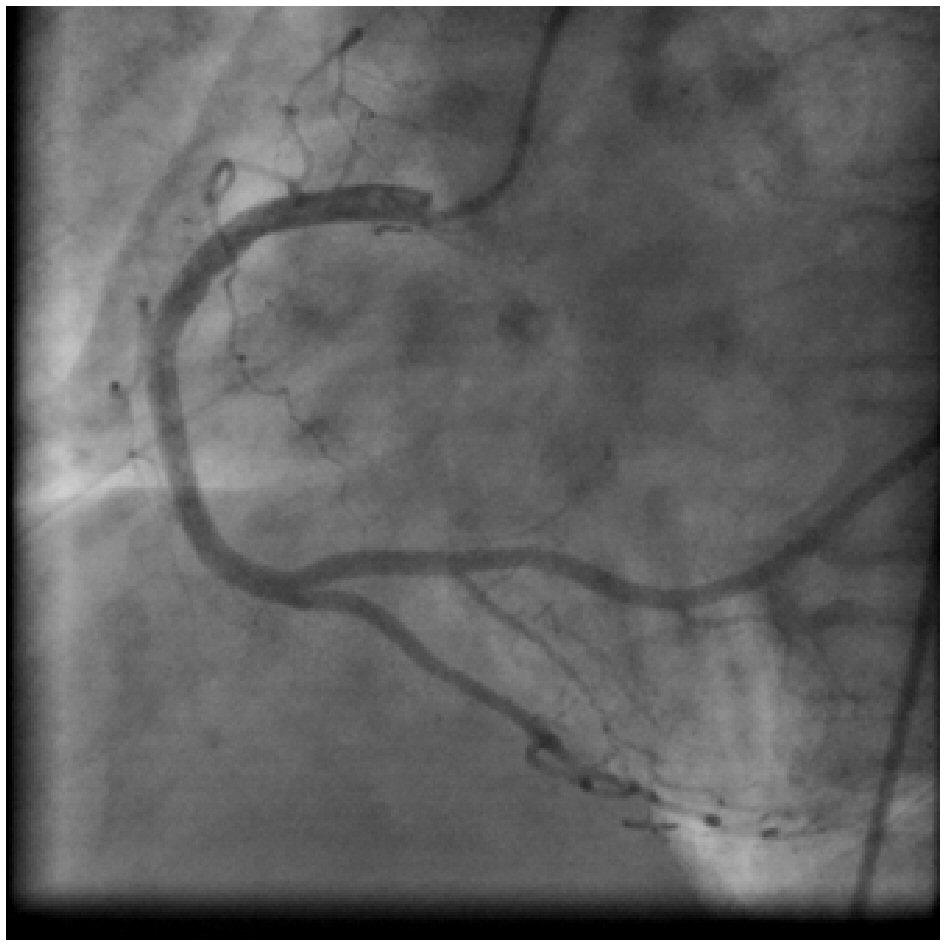 ![]() Click for large image | Figure 1. Left coronary angiogram in right anterior oblique (RAO) cranial view: no circumflex artery is demonstrated. |