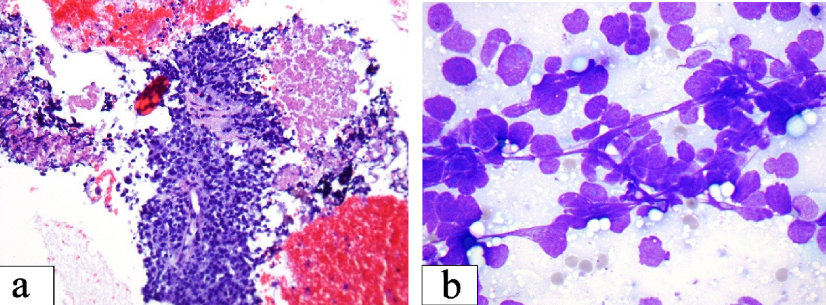 ![]() Click for large image | Figure 1. (a) Small cell carcinoma: loosely cohesive clusters of small cells with high nuclear cytoplasmic ratio and fine chromatin. Streaks of nuclear material and nuclear molding as seen are important diagnostic clue (Smear, Diff-Quik stain, × 600). (b) Necrosis seen as granular pink material in the upper right corner may be prominent. The center of the field shows preserved tumor cells with high nuclear cytoplasmic ratio around capillaries (Cell block section, H&E stain, × 200). |