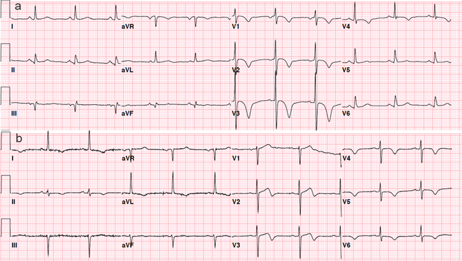 ![]() Click for large image | Figure 1. Electrocardiograms with symmetrically inverted T waves (≥ 0.10 mV) (Fig. 1a) and biphasic T waves in both leads V2 and V3 (Fig. 1b). |